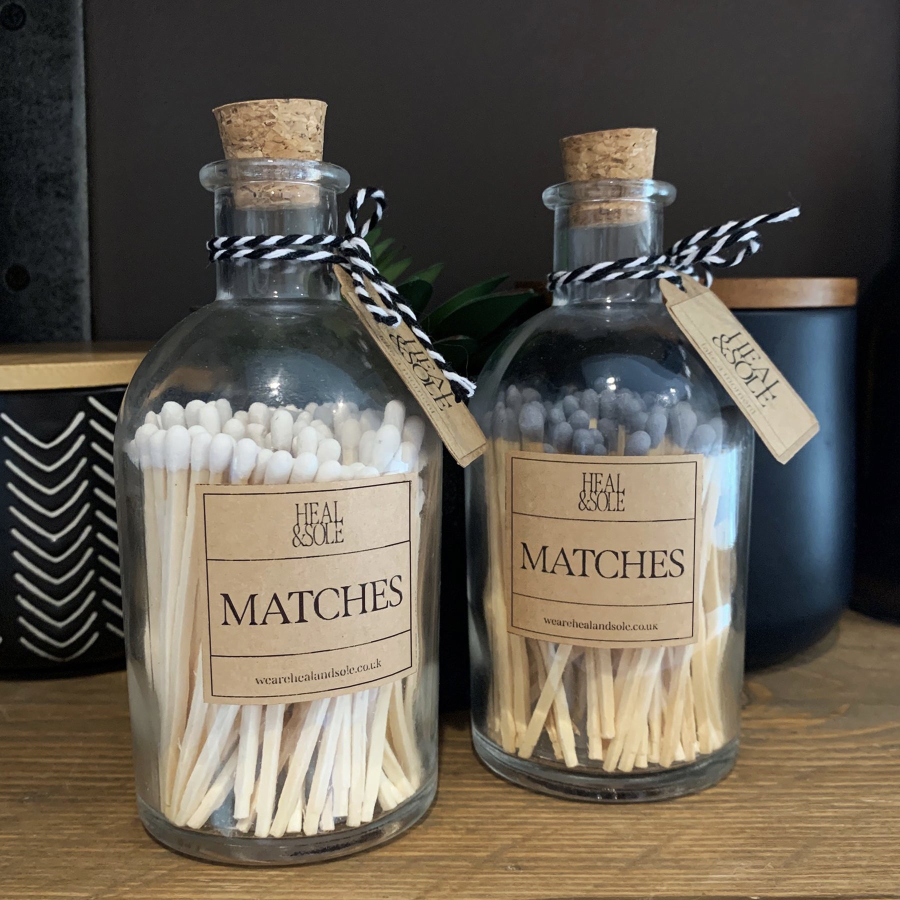 Elevate your shelf with these stylish matches, displayed in an elegant clear glass bottle. Simply pop the cork and tip the bottle up to release a match, strike on the base of the bottle and light your fire or candle with ease.
